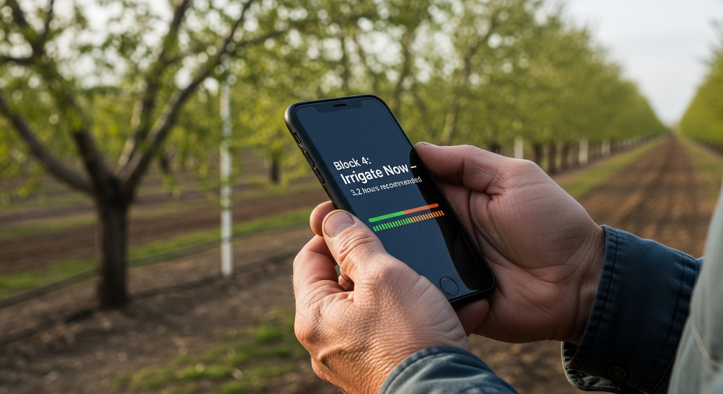 Real-time alerts when a block needs irrigation, with confidence scoring.